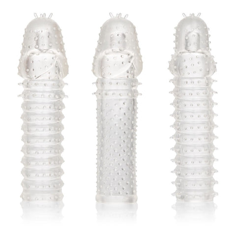The 3 Piece Extension Kit is a set of 3 super tight, close-end extension sleeves with a ribbed texture inside and out for intense stimulation. These enlarging enhancer sleeves wrap tight to increase girth, length and explosive pleasure for everyone involved. The erotic enhancer sleeve’s ultra stretchy material and spacious chamber is made to fit even the biggest man. While you thrill your lover with increased girth and stimulating ticklers, the fulfilling enhancer’s powerful erection support and textured chamber result in explosive results for both of you. The textured chamber and erection enhancer provide increase stimulation and powerful support. Wrap your pleasure tool in this super stretchy sleeve to easily increase stamina, stimulation and orgasmic pleasure. The flexible enhancer is made from a hygienically superior TPR. This body safe material is unscented and phthalate free to keep your most sensitive spots happy and healthy